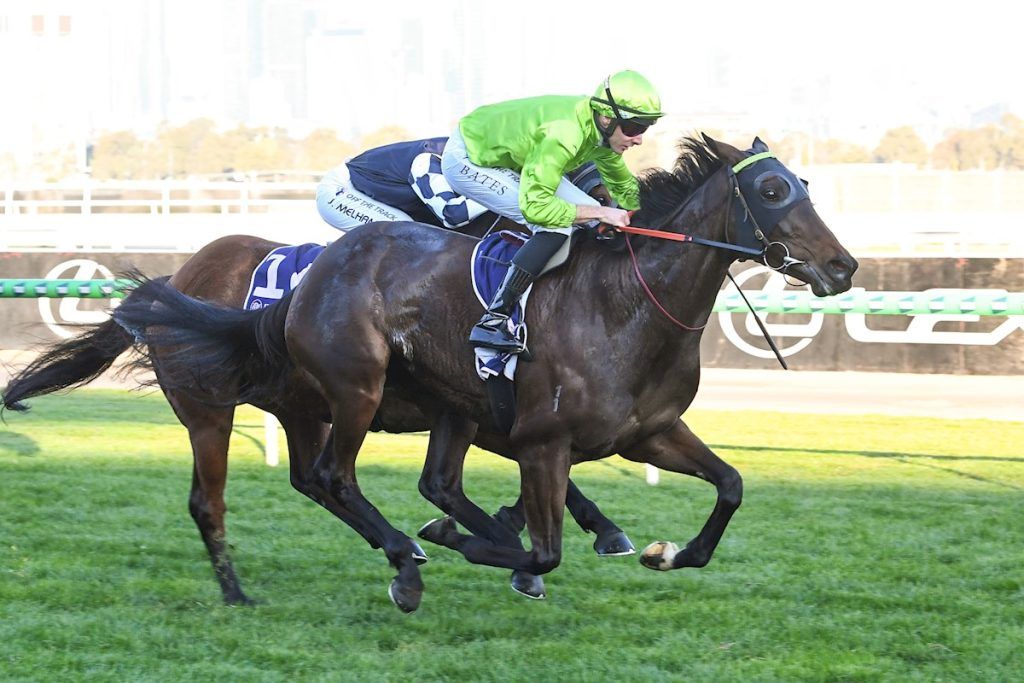 Too Darn Discreet ridden by Declan Bates wins the 2025 Melbourne Cup Carnival On Sale at Flemington Racecourse on August 02, 2025 in Flemington, Australia. (Photo by Brett Holburt/Racing Photos)